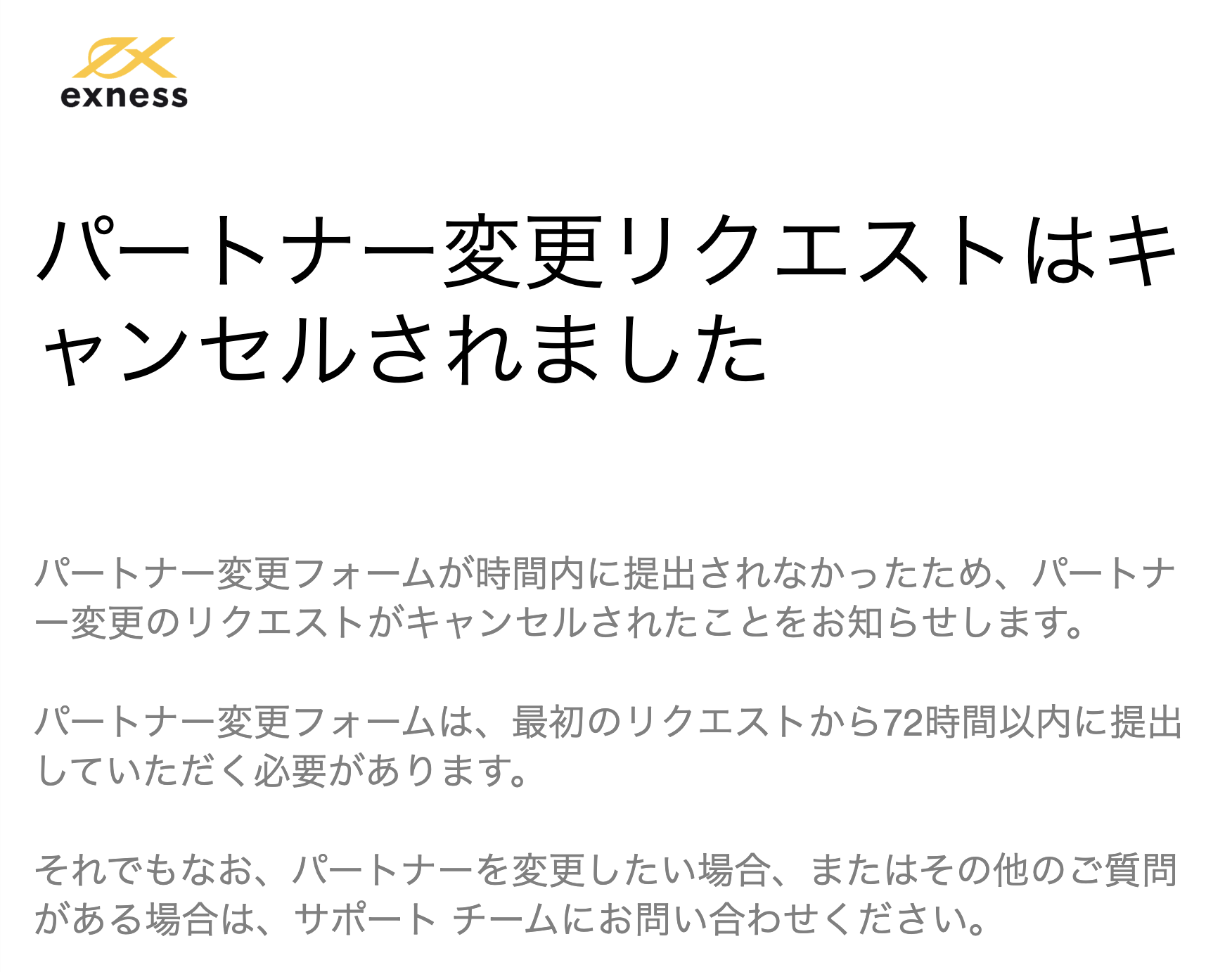 サポートに連絡した数日後に、Exness Supportからメールが届きます。メールが届くとエクスネスのマイページからパートナー変更リクエストを送ることができるようになります。